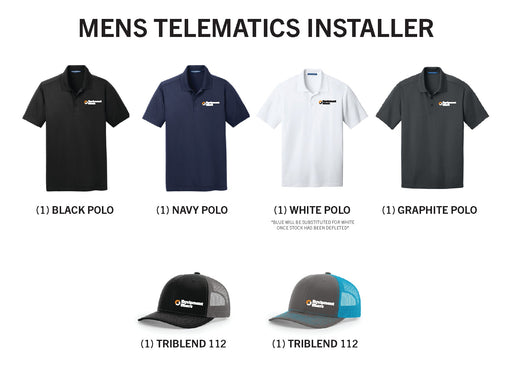 Horizon Companies - Equipment ShareMen's Telematics Installer Kit includes: (5) K569 Port Authority Men's Diamond Jaquard Polo in Black(1), Blue(2), Navy(1), and Graphite(1). Also, i...